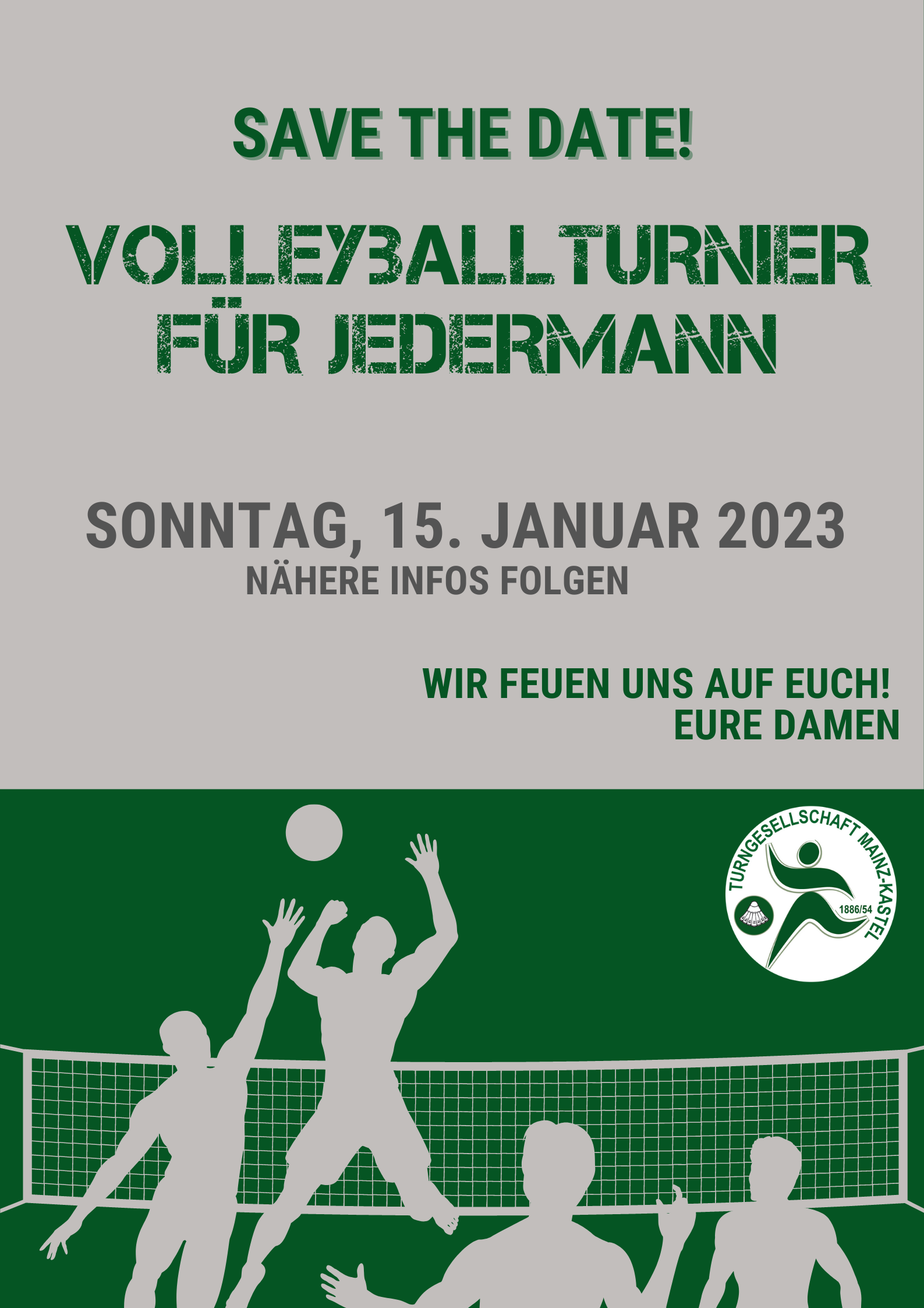 Liebe Sportler*innen, Freunde und Fans der TG Kastel, nach langer Corona-Zwangspause kann unser Volleyballturnier endlich wieder stattfinden! Den Termin kennt ihr bereits: Sonntag, den 15.01.2023 - wie gewohnt in der WLS!Spielbeginn ist um 11 UhrAnmeldung am Tag selbst bitte bis spätestens 10.30 Uhr. Gespielt wird wie gehabt auf drei Feldern, die Spielzeit beträgt ca. 10-15 Minuten. Ihr seid herzlich dazu eingeladen, Euch als Mannschaft (auch bunt gemischt) mit mindestens 5 Personen anzumelden. Die Teilnahme ist ab der B-Jugend möglich. Für Essen und Getränke wird gesorgt sein! Also auf geht’s an die Anmeldung! Sendet einfach eine Mail mit euren Namen und...